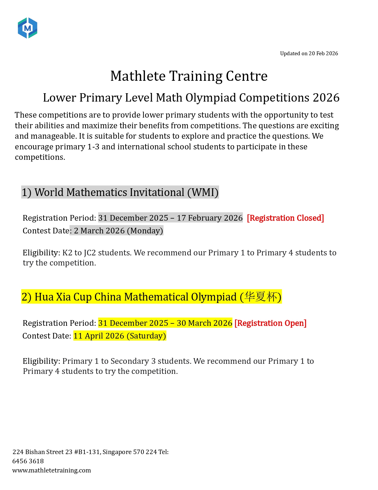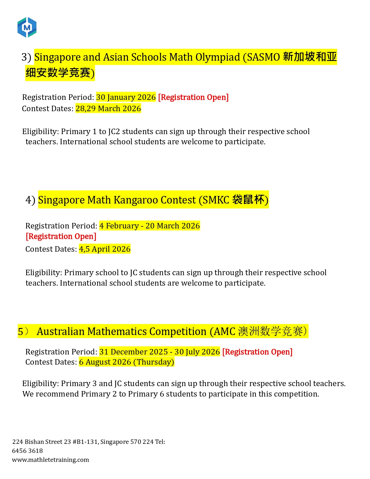 This is a list of Math Olympiad Competitions MTC has compiled for our lower primary (P1-P4) students.