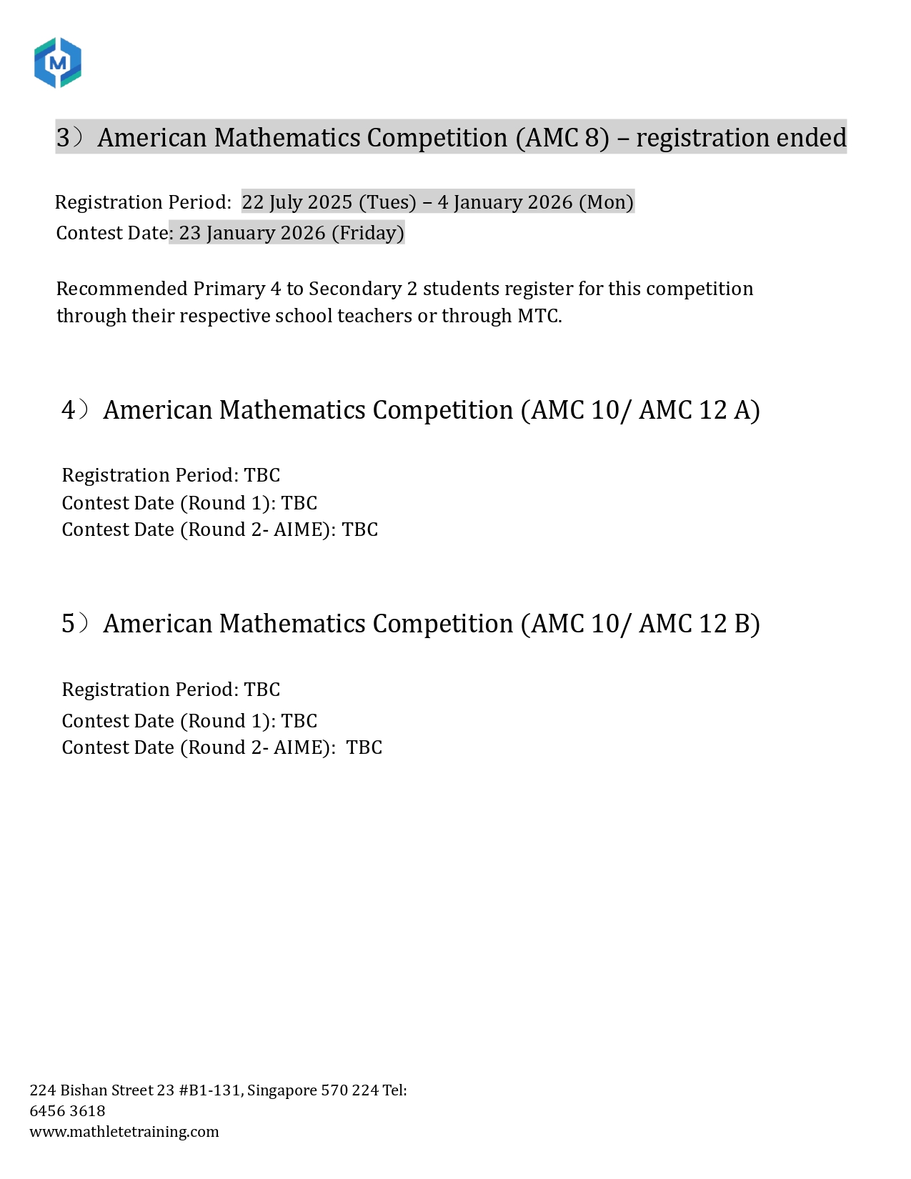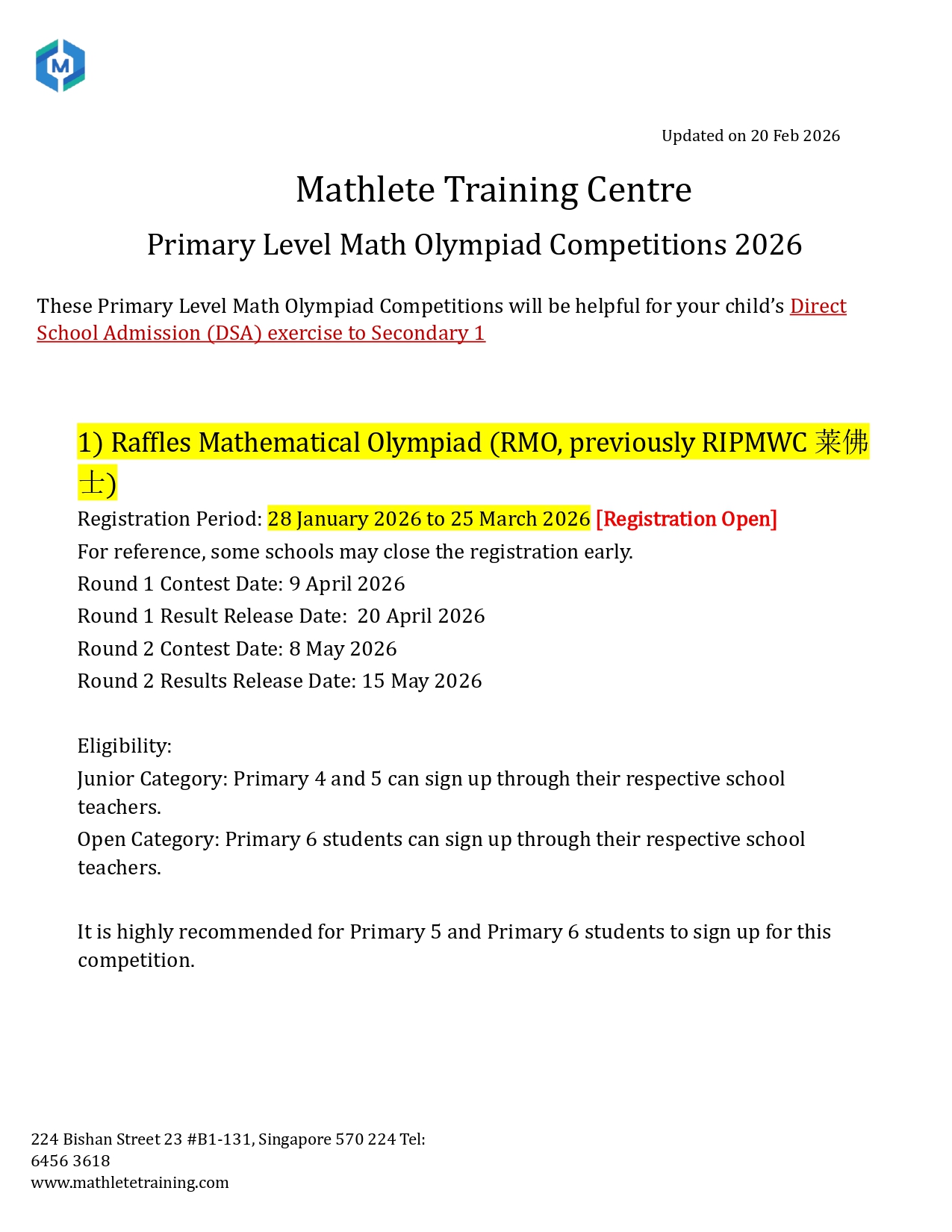 This is a list of Math Olympiad Competitions MTC has compiled for Upper primary (P4-P6) and (S1-JC 2) students.